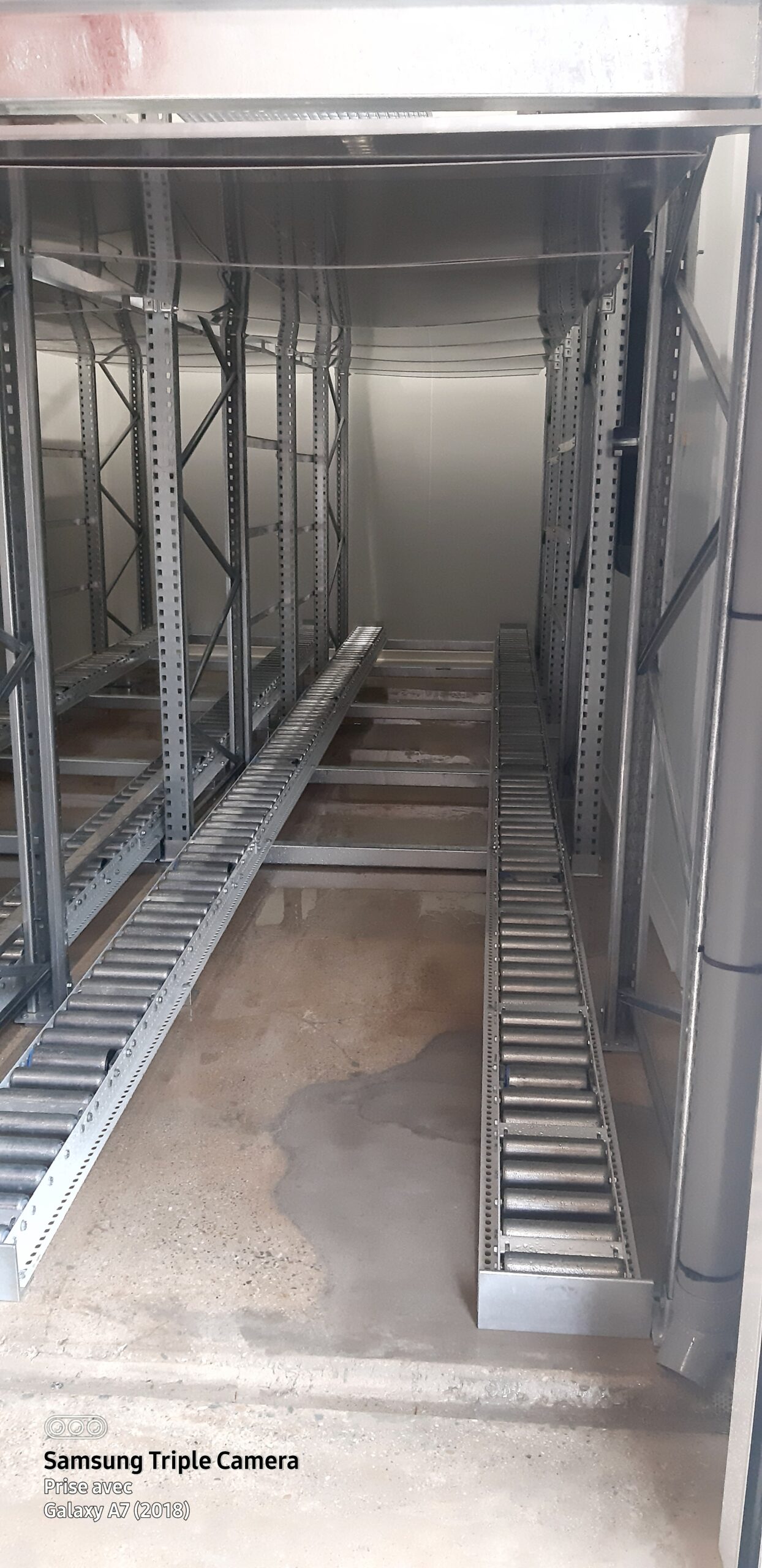 Chaque cellule accueille 1 casier accumulation  de 2 travées équipées d’une piste à rouleaux libre sur 2 niveaux  pour 8 palettes en profondeur soit le volume nécessaire pour un pressoir.